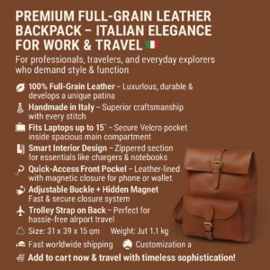 Luxury Full-Grain Leather Backpack – Handmade Italian Work, Travel and Everyday Bag