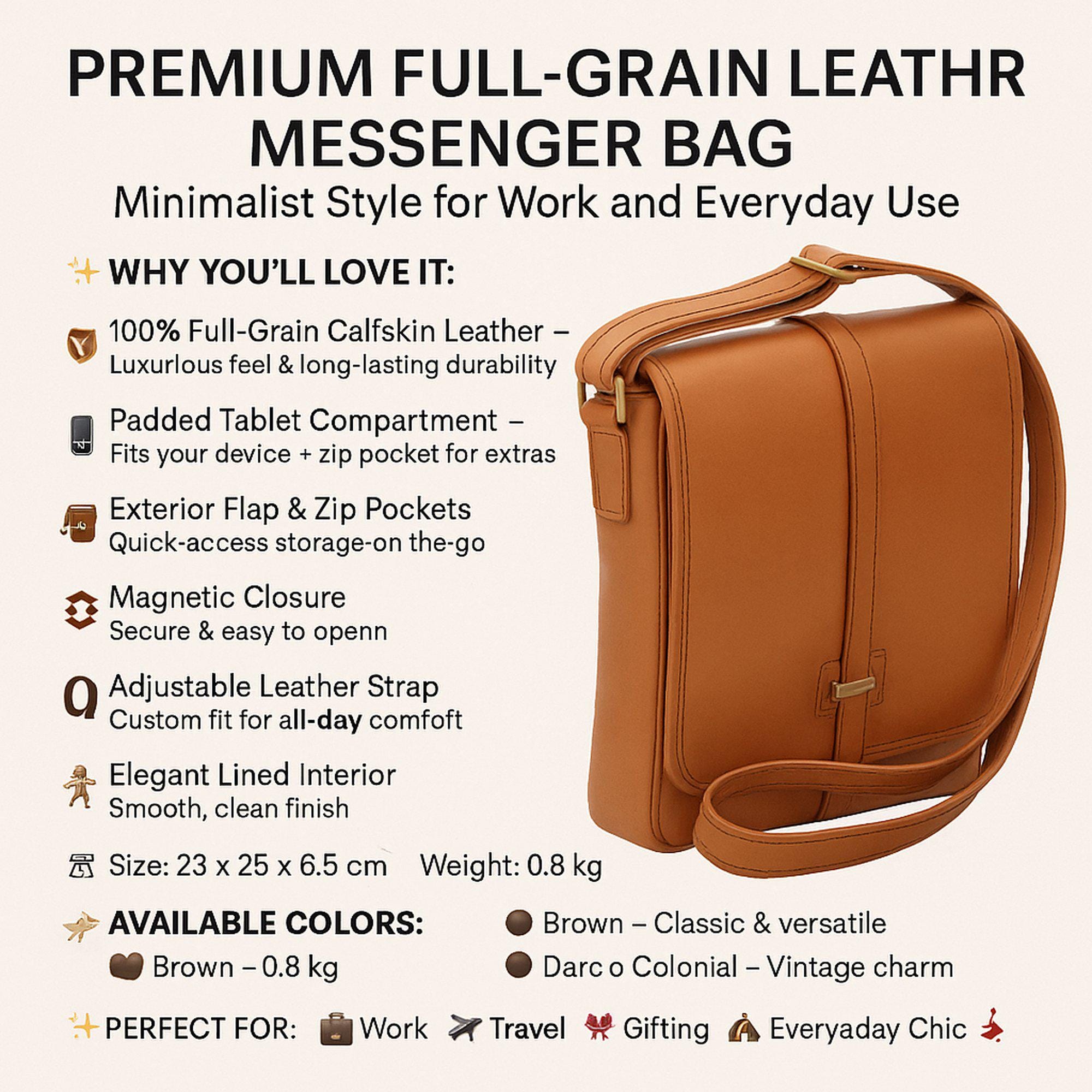 📁 Premium Full-Grain Leather Messenger Bag – Minimalist Style for Work and Everyday Use